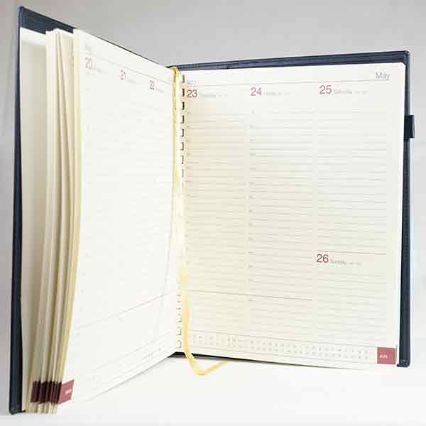 Variants Available: Available in 10 colours;Blue/Royal Blue, Blue/Green, Blue/Aqua, Black/Grey, Black/Orange, Black/Purple, Black/Red, Black/Royal Blue, Black/Tan, Black/MustardInsert section: Week to view - White or Cream PaperInternational Week to View – Cream PaperDesk notebook - White Paper