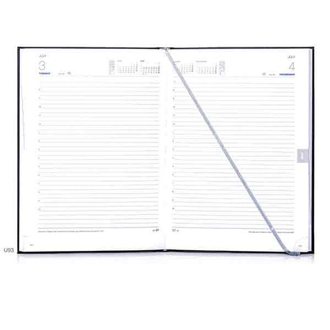 • Soft touch padded PU cover with white paper, day to view portrait layout, plain ribbon marker, silver page edges and blind embossed date