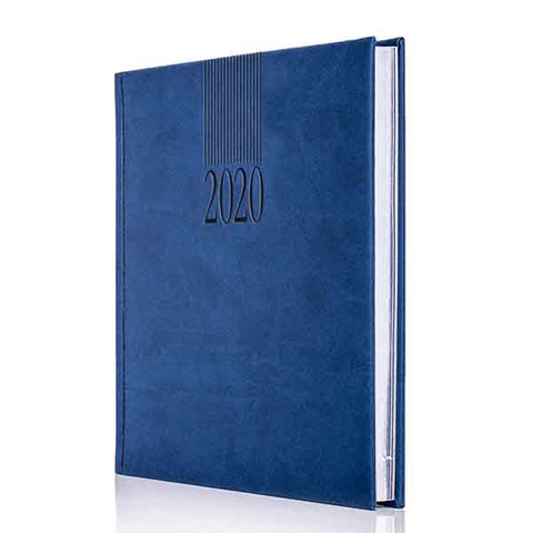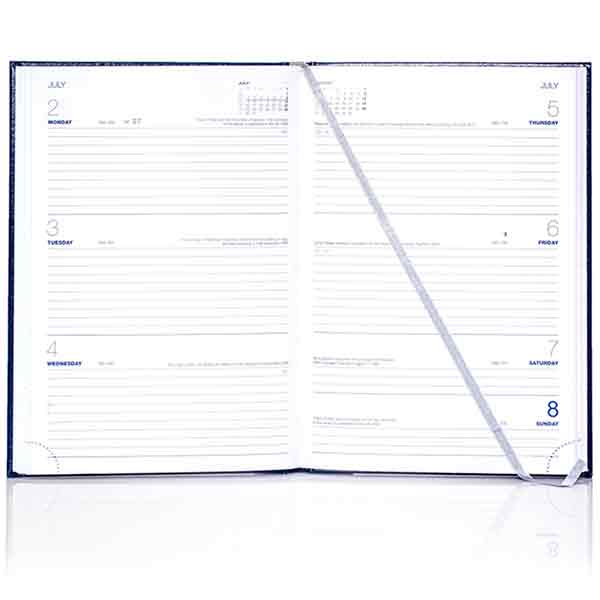• Soft touch padded PU cover with white paper, week to view, portrait layout, plain ribbon marker, blind embossed date, silver page edges and UK/World maps