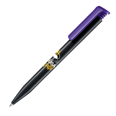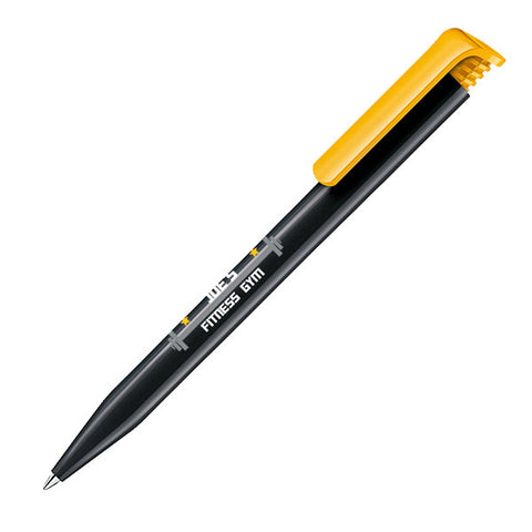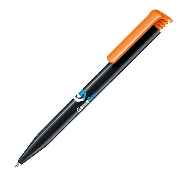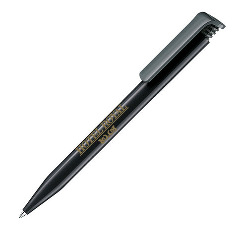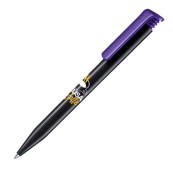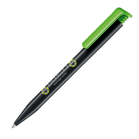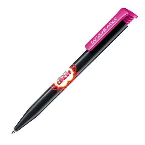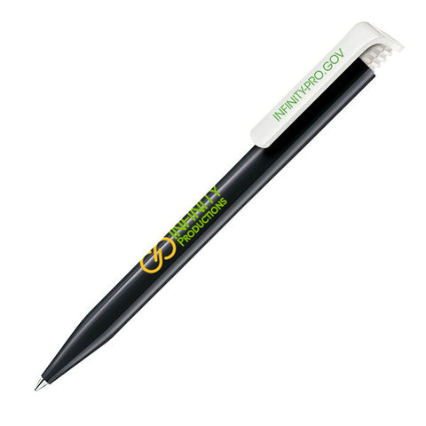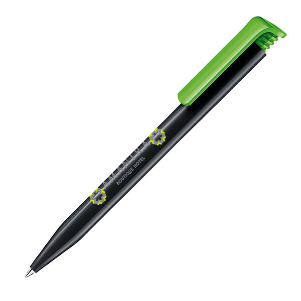 - Ballpen with opaque high-gloss finish black barrel made from 95% recycled material, and coloured clip