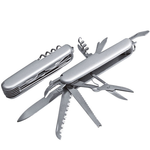 - Large blade, large and small saw, scissors, nail file and cleaner, can opener, bottle opener, corkscrew, toothpick, tweezers, screw head and slotted screwdriver and a key ring